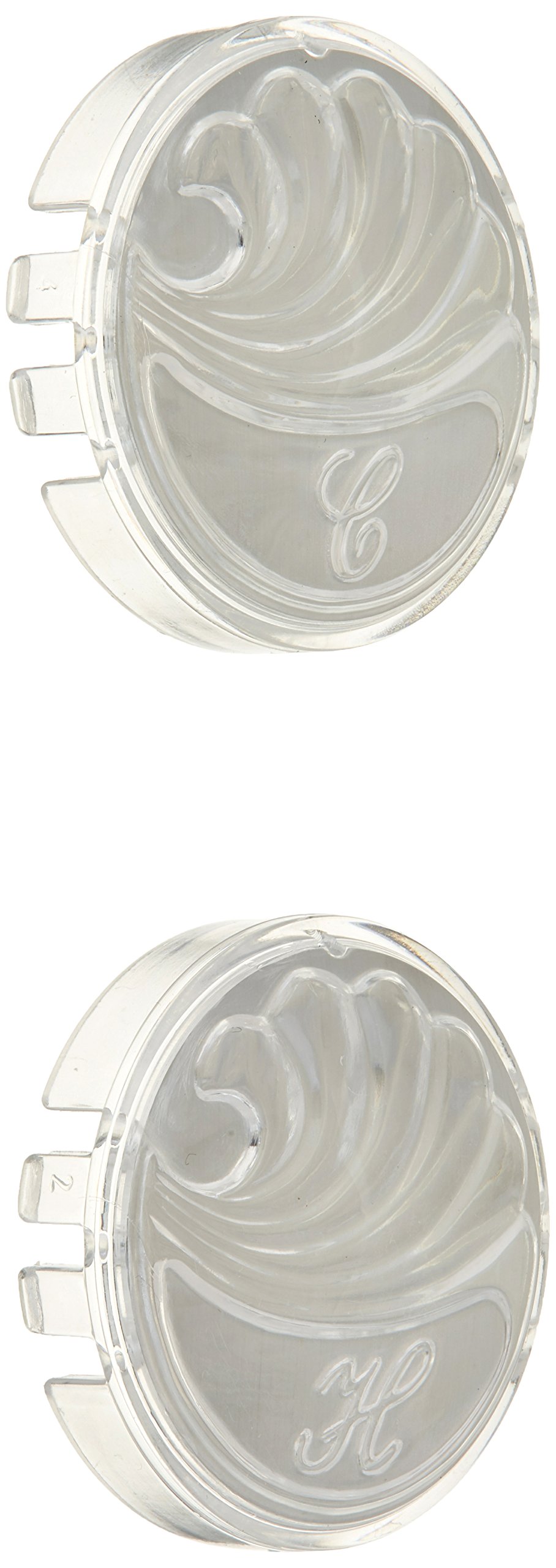 Image: Danco 88698 Faucet Index Buttons, featuring a clear acrylic design with 'H' and 'C' labels for hot and cold water.