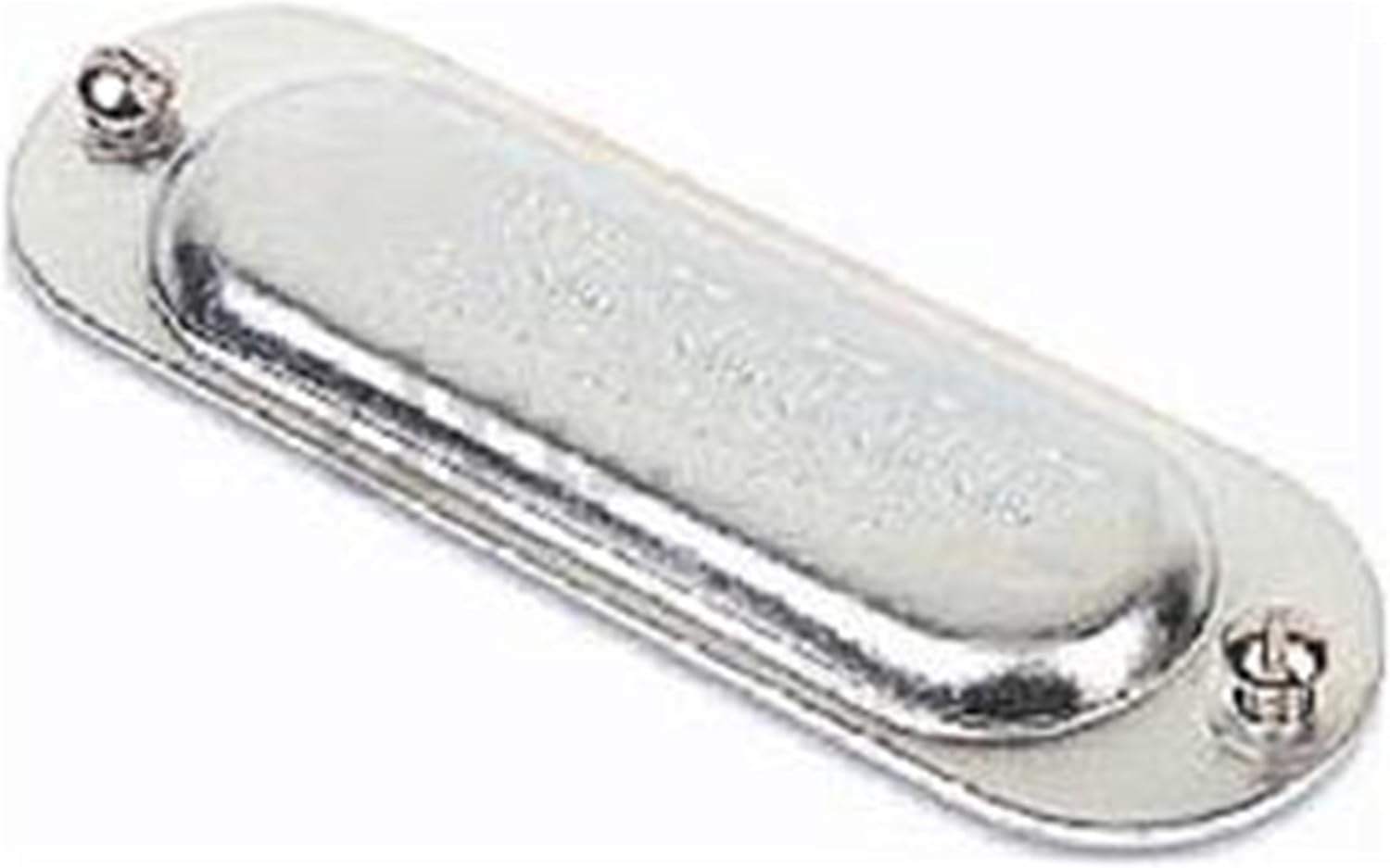 An image showing the Crouse-Hinds 270 SA 3/4-Inch Aluminum Sheet Wedgenut, a silver-colored, elongated oval-shaped conduit outlet body with two screws on either end for securing the cover.