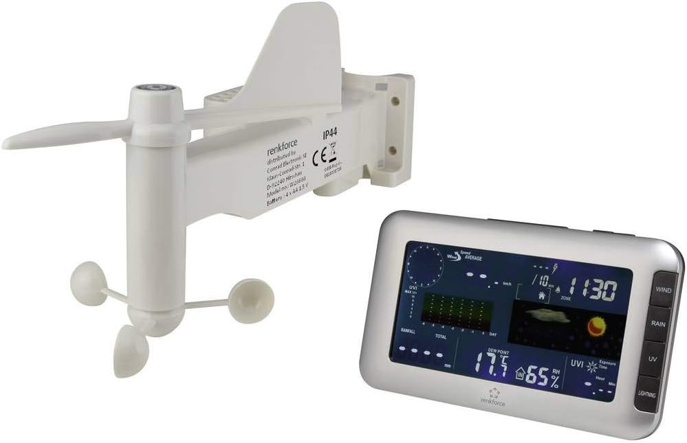 Figure 1: Renkforce W205GU main display unit and integrated outdoor sensor. The outdoor sensor measures wind speed, precipitation, UV, lightning, temperature, and humidity.