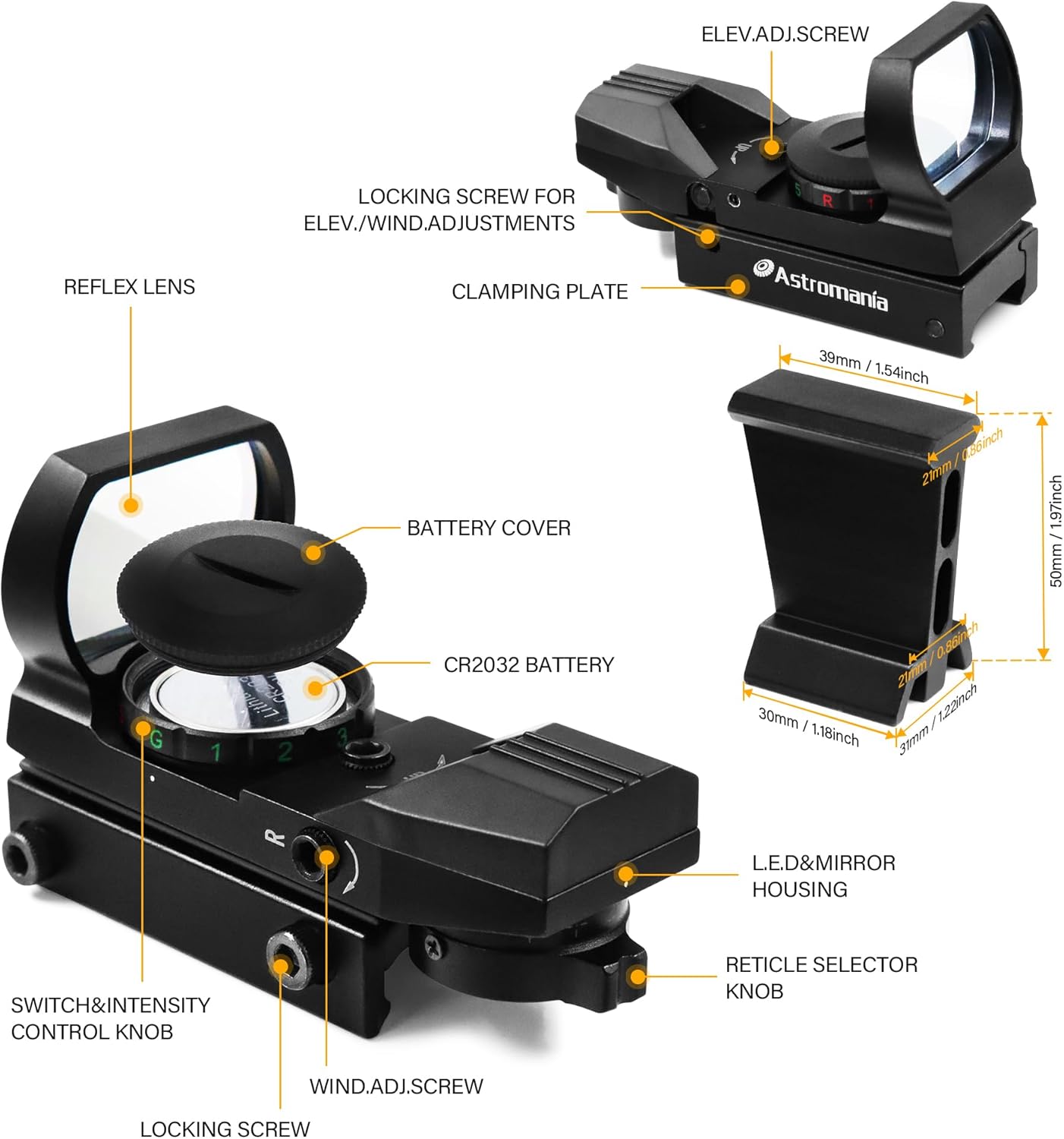- Reticle Selector Knob: Allows selection of four different aiming patterns.