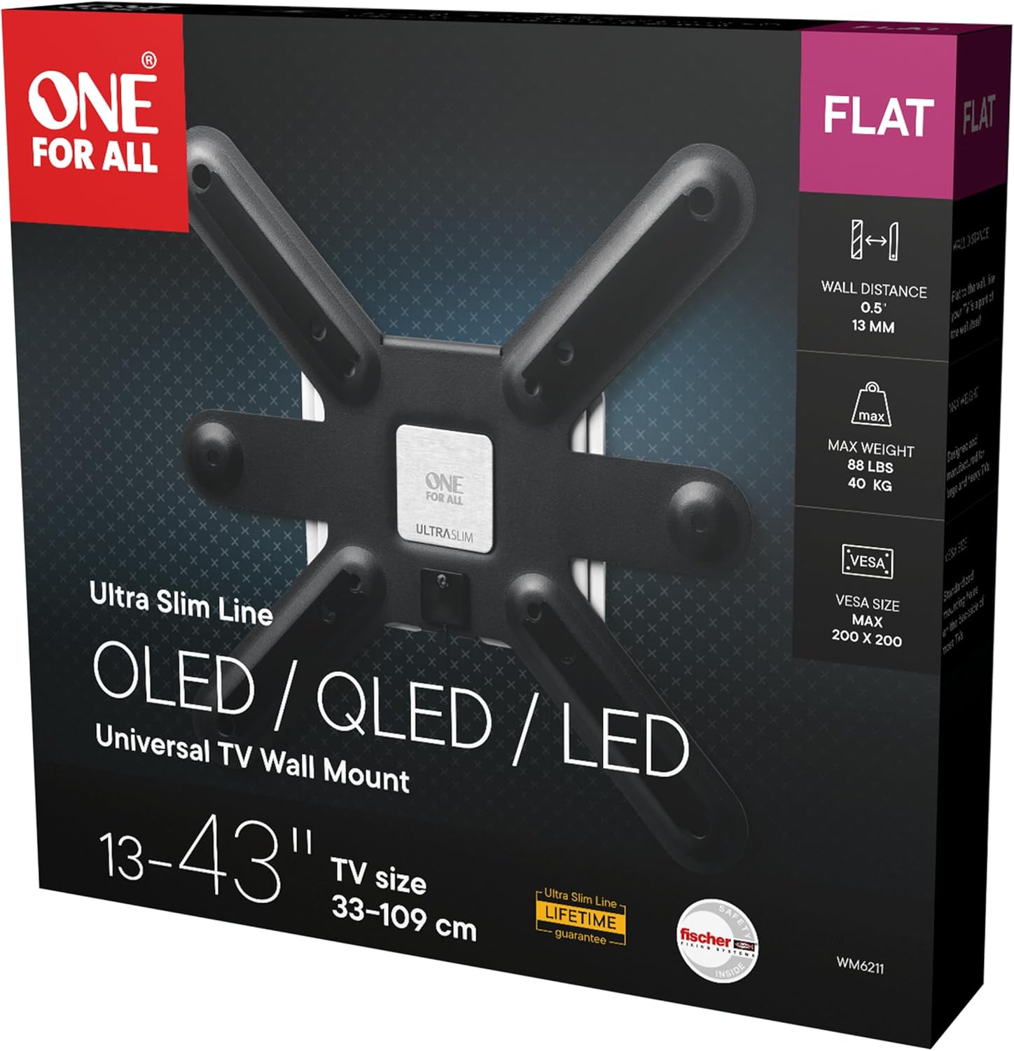 This manual provides detailed instructions for the safe and correct installation and use of your One For All WM6211 Ultra-Slim Fixed TV Wall Mount. This mount is designed to securely hold televisions with screen sizes ranging from 13 to 42 inches and a maximum weight of 40 kg (88 lbs). It offers a fixed mounting solution with a minimal wall distance of only 13 mm, suitable for LED, LCD, and Plasma TVs.