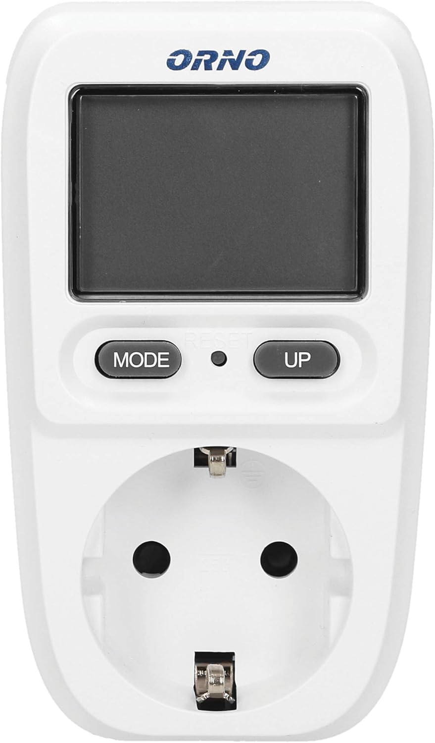 Image shows the front of the Orno WAT-419(GS) electricity meter, highlighting the LCD display, 'MODE' button, 'UP' button, and the integrated Schuko (Type F) socket.