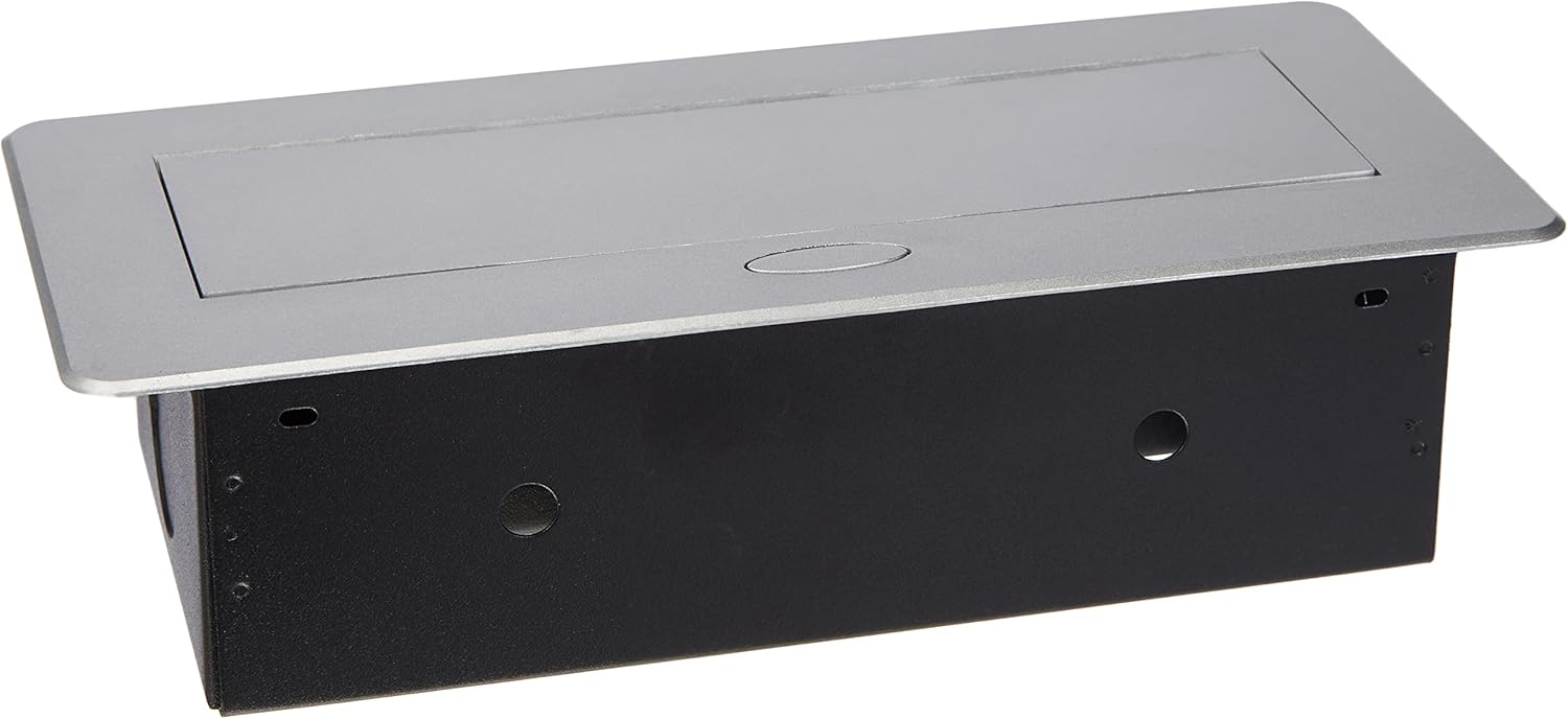 This image shows the power strip fully retracted, flush with the surface. The silver-colored top cover blends seamlessly into modern furniture or countertops, providing a discreet power solution when not in use.
