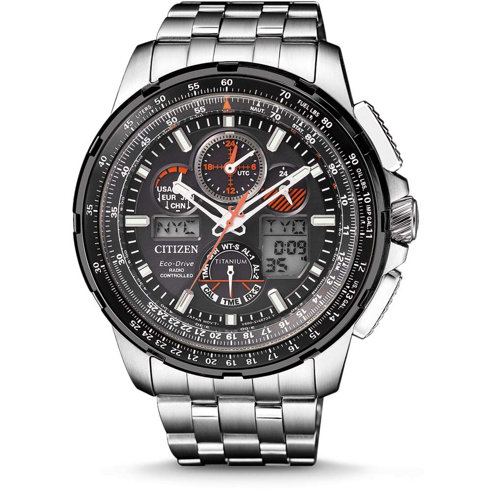 Imej: Depan view of the Citizen Promaster Eco-Drive Radio Controlled Watch JY8069-88E, showcasing its black dial and titanium bracelet.