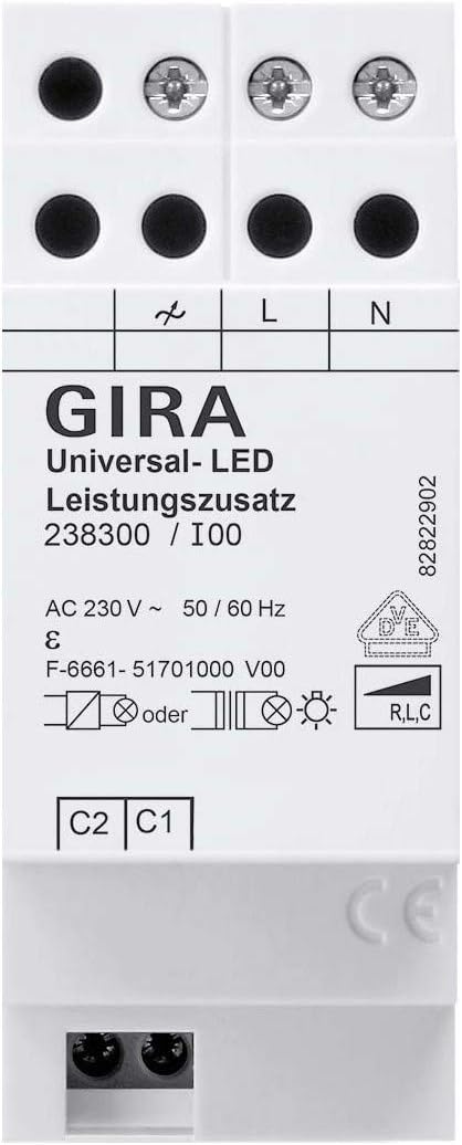 The GIRA Universal-LED Power Add-on Module 238300 is designed for integration into existing electrical installations. Refer to the wiring diagram on the device and consult local electrical codes.