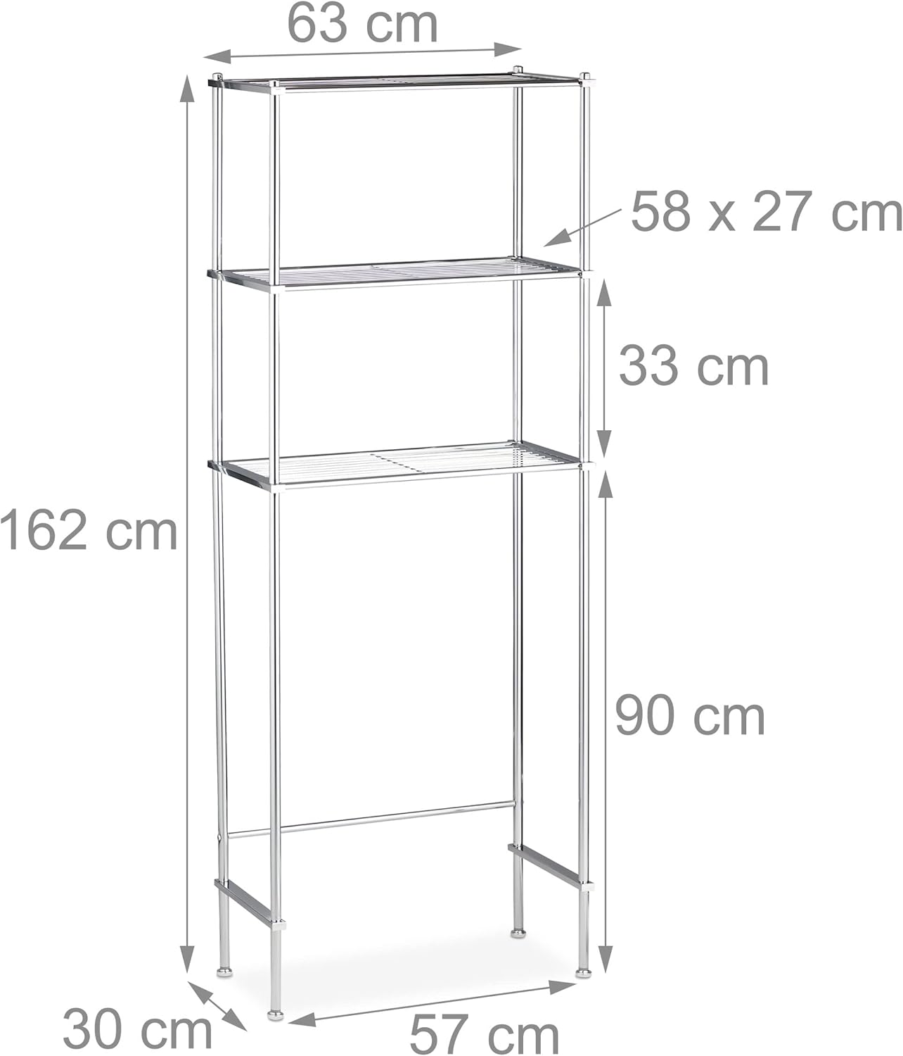The shelf measures approximately 162 cm (H) x 63 cm (W) x 30 cm (D). Each shelf is approximately 58 cm (W) x 27 cm (D). The lower shelf is positioned approximately 90 cm from the floor, providing clearance for most washing machines or toilets.