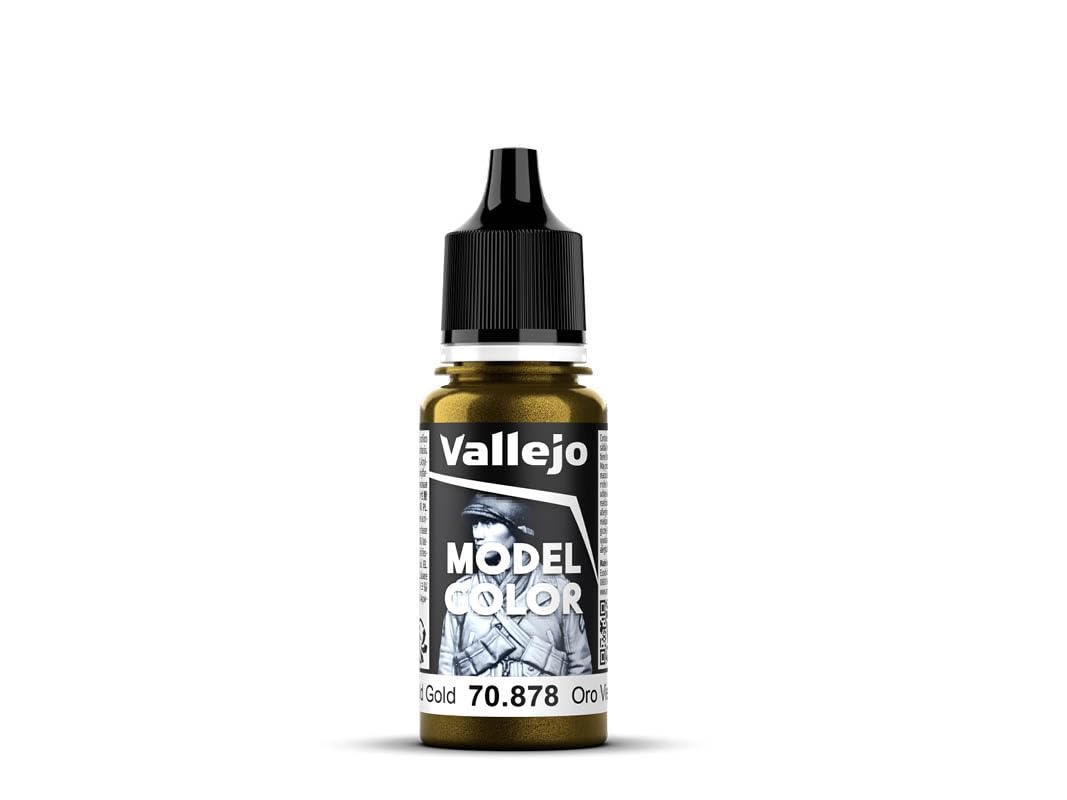 A 17ml dropper bottle of Vallejo Model Color 70878 Old Gold acrylic paint, featuring the brand logo and color name.