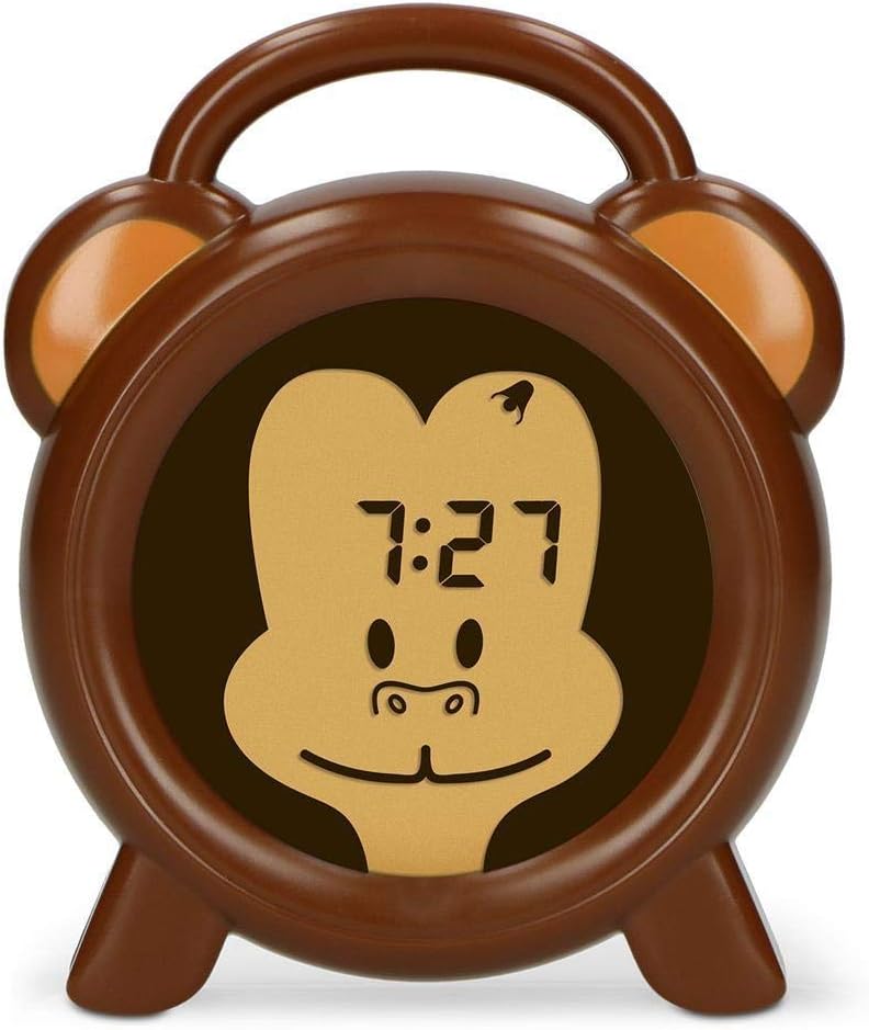 The BC-100 Monkey Alarm Clock features a friendly monkey design with an integrated digital display. Its primary function is to visually communicate sleep and wake times through color-changing lights.