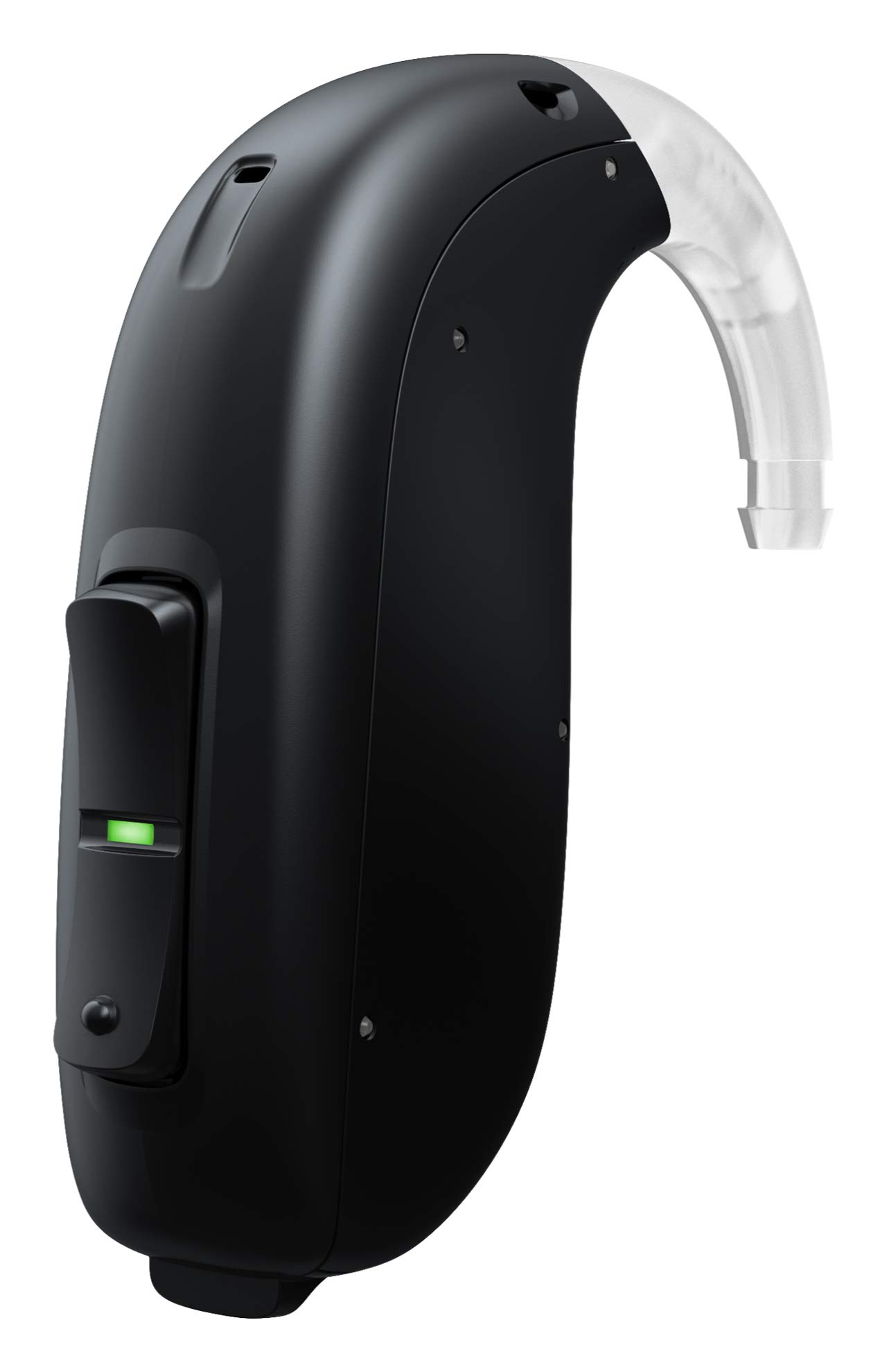 Image: Oticon Get P BTE Hearing Aid. This image displays the black Oticon Get P BTE hearing aid, highlighting its compact design and the ear hook component.