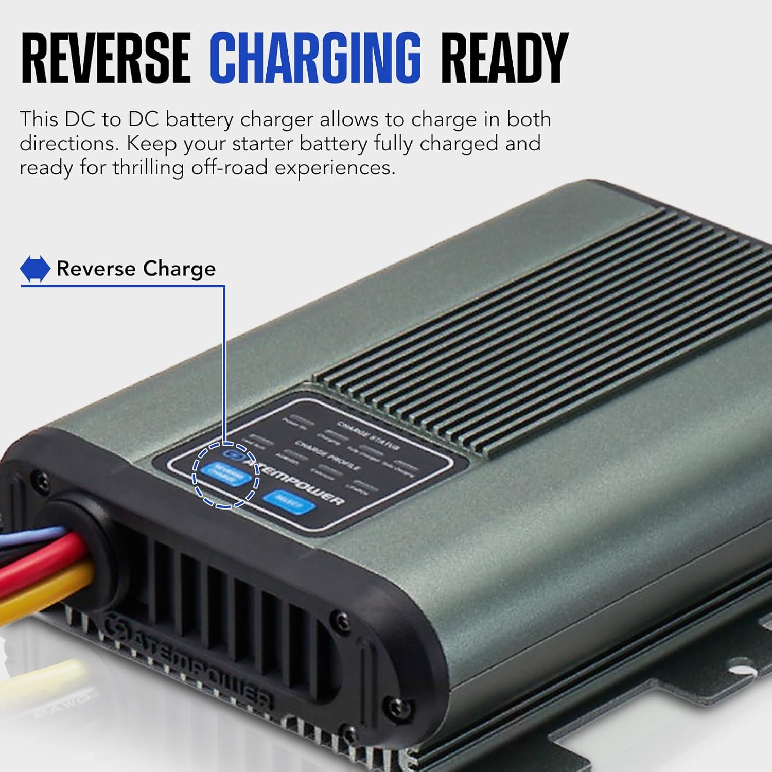 The reverse charging feature allows you to charge in both directions. Activate the reverse charge button to revive a flat start battery using your auxiliary battery, keeping your starter battery fully charged for off-roading experiences.