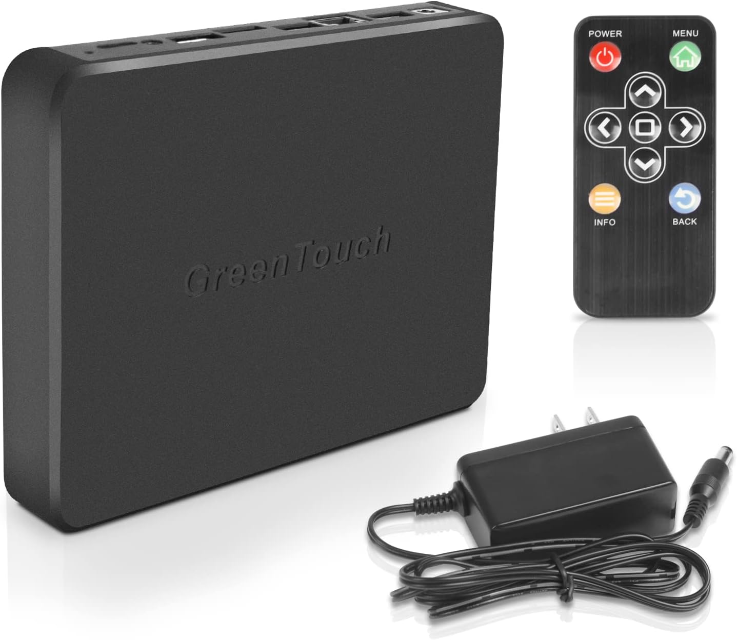 Rajah 1: Green Touch RK3368 Industrial Android TV Box, including the main unit, IR remote control, and power adapter.