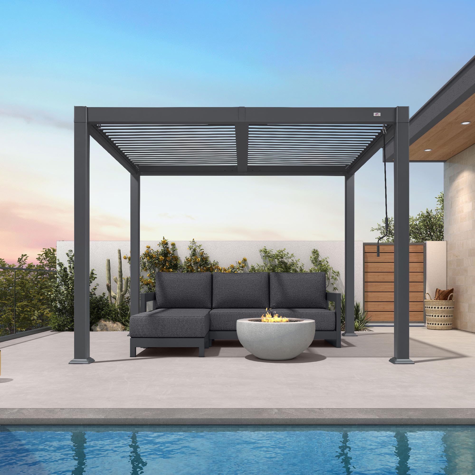 The pergola features an aluminum louvered roof with louvers that can rotate from 0° to 85°. This allows you to precisely control the amount of sunlight and airflow. To adjust the louvers, use the integrated mechanism, typically a crank or lever system, to open or close them to your desired position. This flexibility provides reliable protection and customization for various weather conditions.