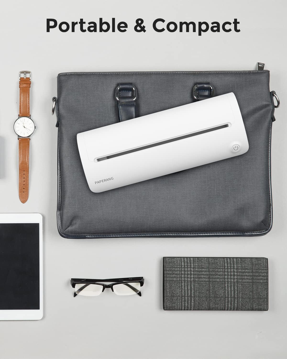 Image: The Paperang GO printer is shown fitting compactly into a briefcase, highlighting its portability.