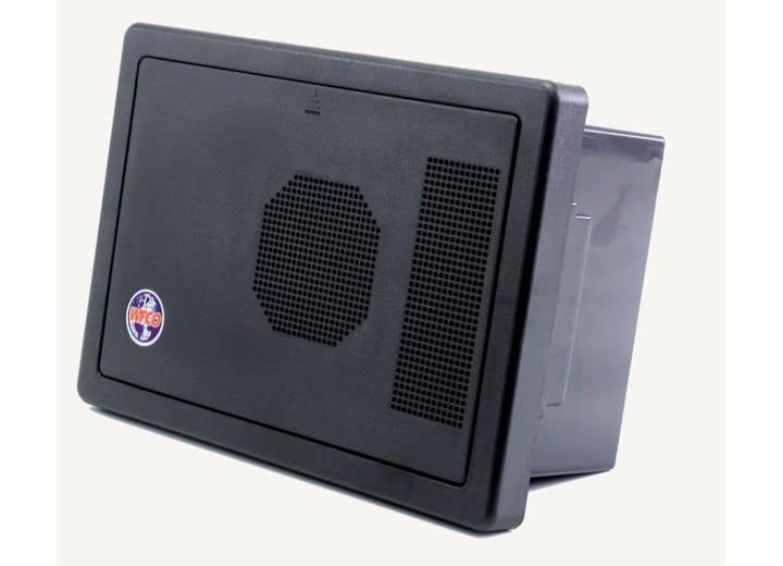 This image displays the WFCO WF-8725-AD Power Center. It is a compact, black rectangular unit designed for RV electrical systems. The front panel features a large perforated area for ventilation and a smaller section, likely for circuit breakers or fuses, along with the WFCO brand logo.
