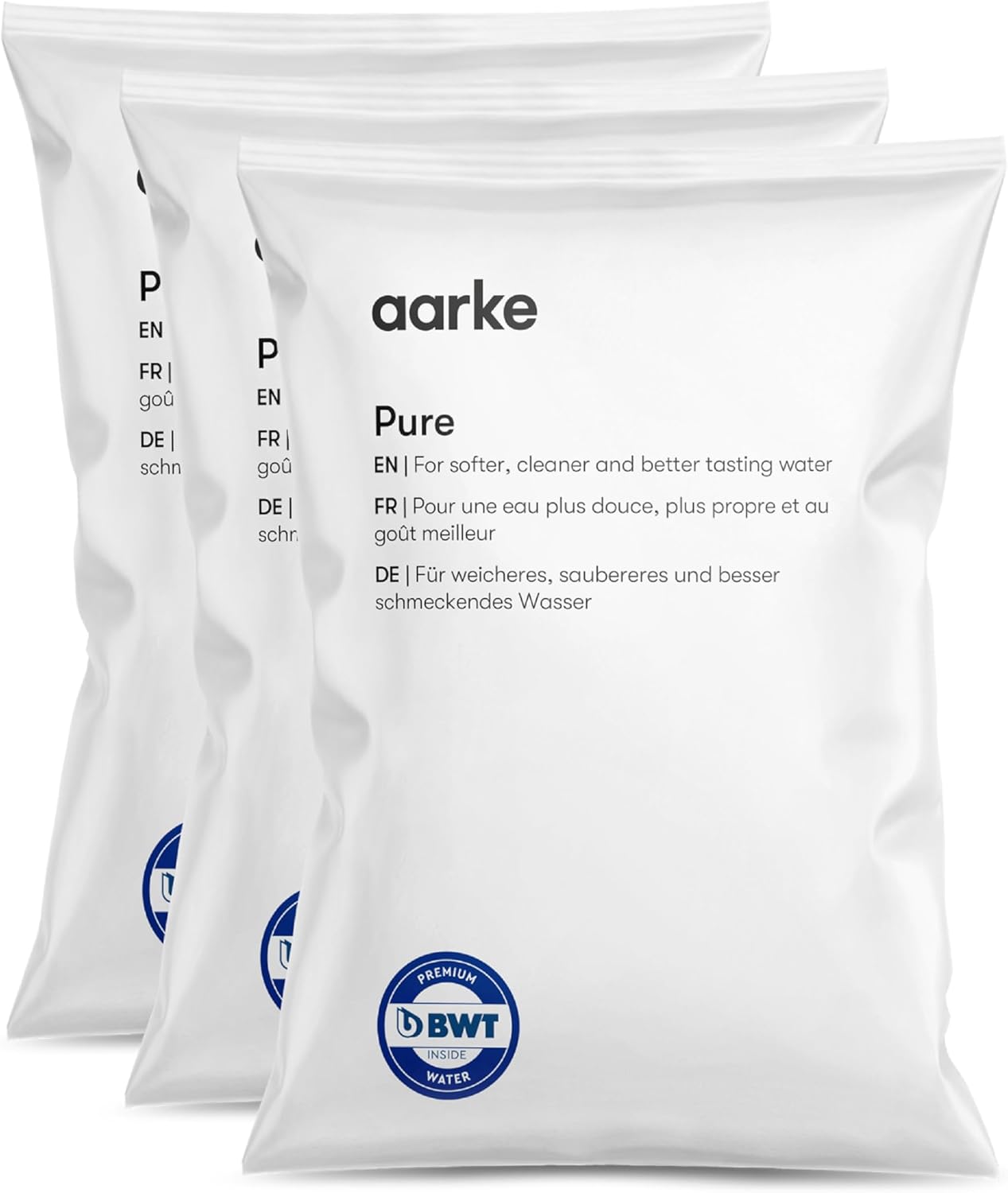 Image: Three individual bags of Aarke Pure filter granules, as typically found in the product packaging.