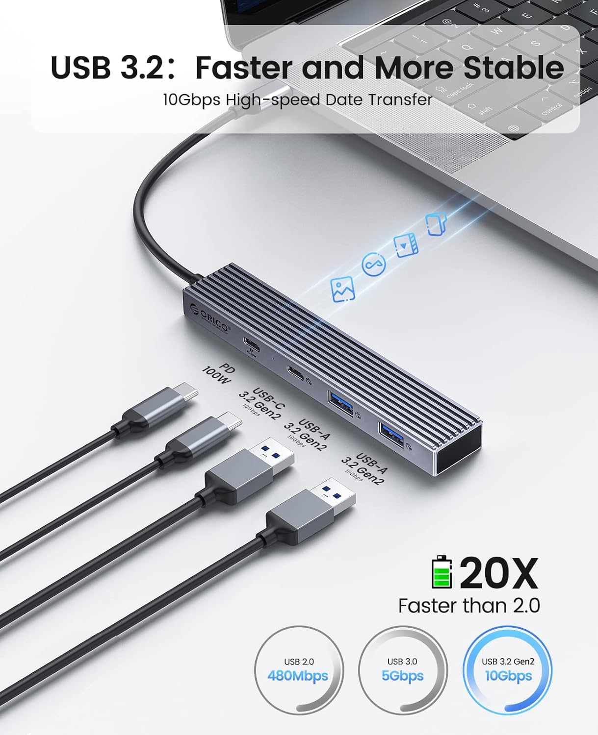- Sambung ke Peranti Hos: Plug the integrated USB-C cable of the ORICO DHF-2U2C hub into an available USB-C port on your laptop, PC, MacBook, or other compatible device.