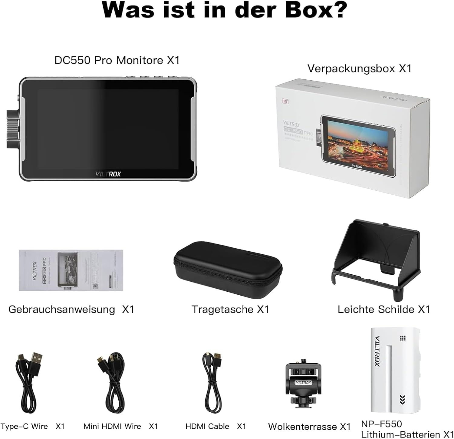 Image: Contents of the VILTROX DC-550 Pro package, including the monitor, carrying case, sun hood, user manual, Type-C cable, Mini HDMI cable, HDMI cable, hot shoe mount, and NP-F550 battery.