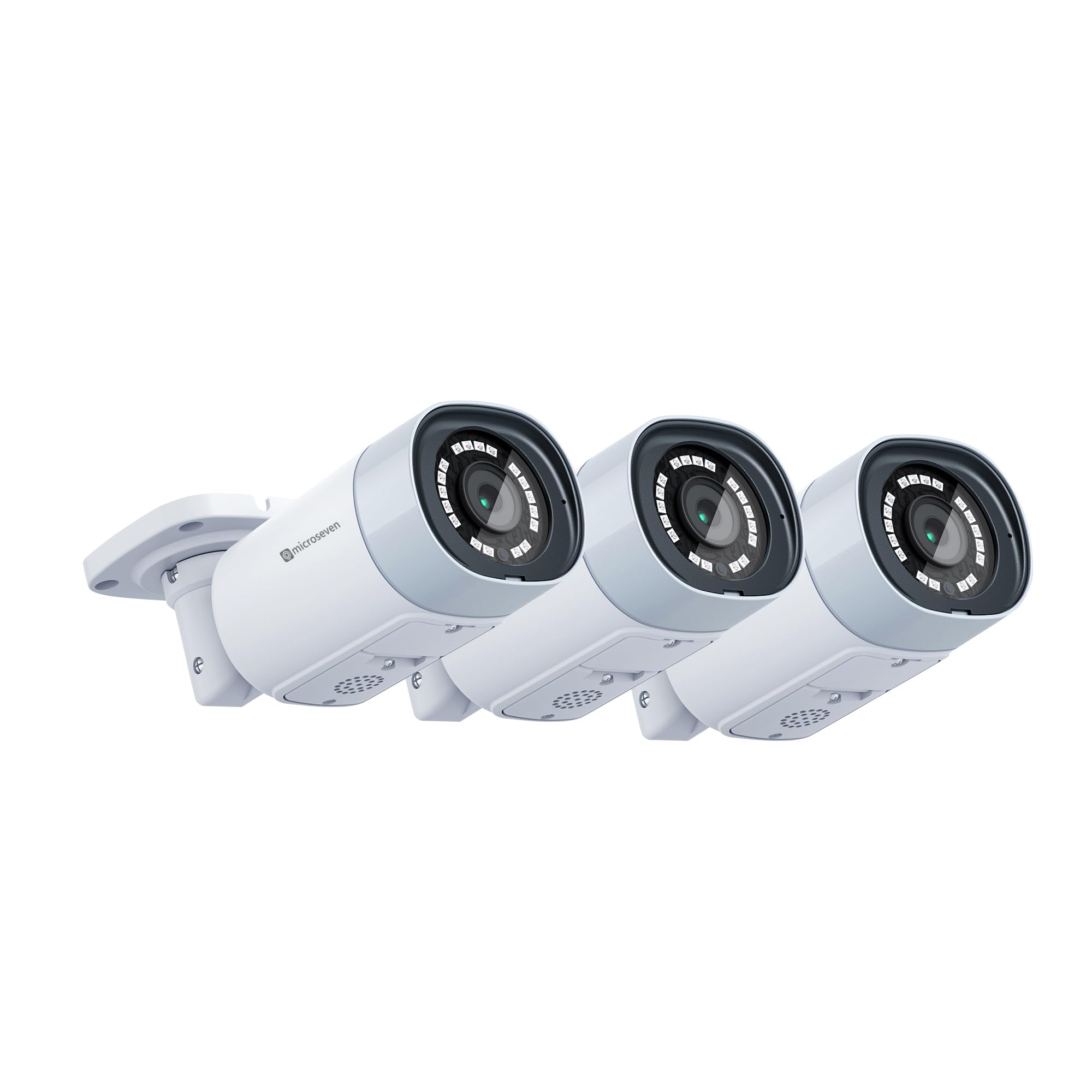 Image 1.1: Three Microseven M7B4K-PSAA 4K IP PoE security cameras. These cameras offer 8MP resolution and wide-angle viewing.