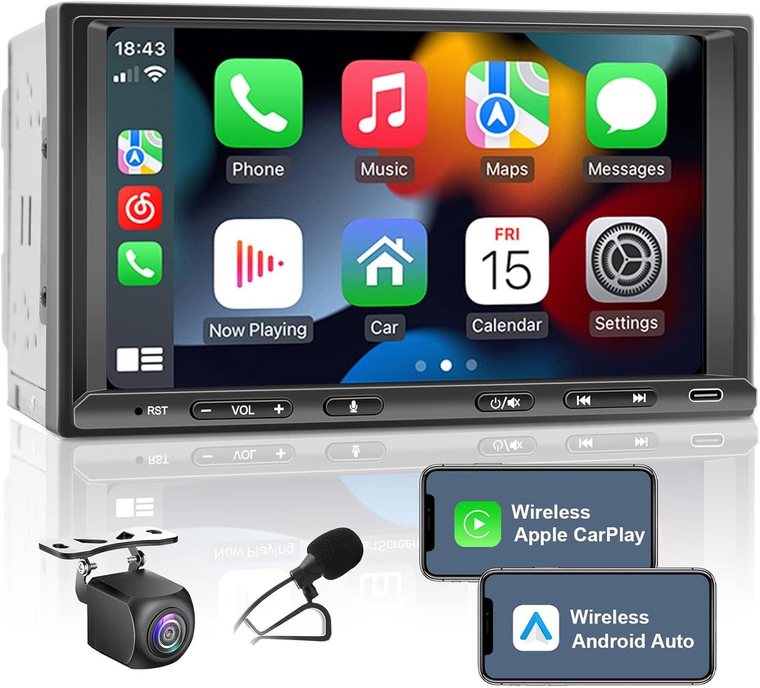 The unit supports both wireless and wired Apple CarPlay and Android Auto for seamless smartphone integration.