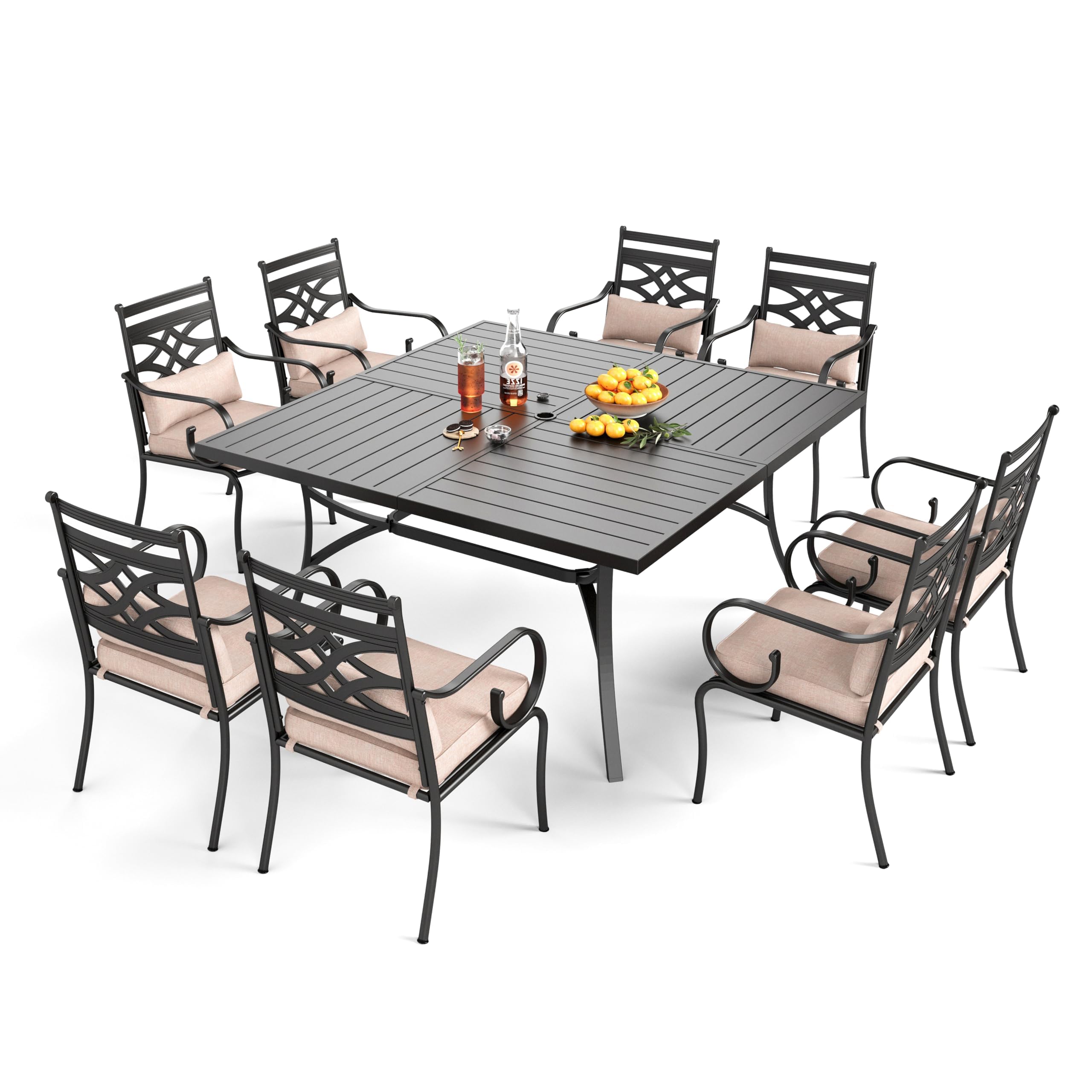 The PHI VILLA 9-Piece Outdoor Dining Set is designed for comfortable outdoor dining and relaxation. The chairs are fixed, providing stable seating. The table's central hole is suitable for most standard patio umbrellas (umbrella not included) to provide shade.