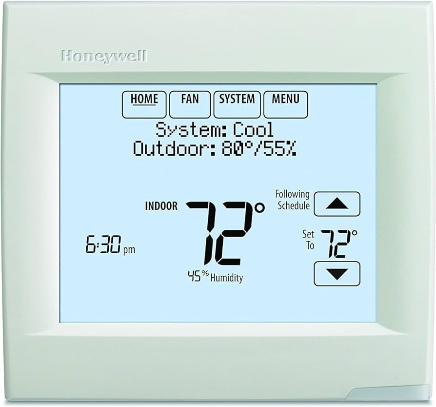Rajah 1: Generic TH8321R1001 Vision PRO 8000 Thermostat. This image shows the front of the thermostat, highlighting its touchscreen display and sleek, white rectangular form factor.