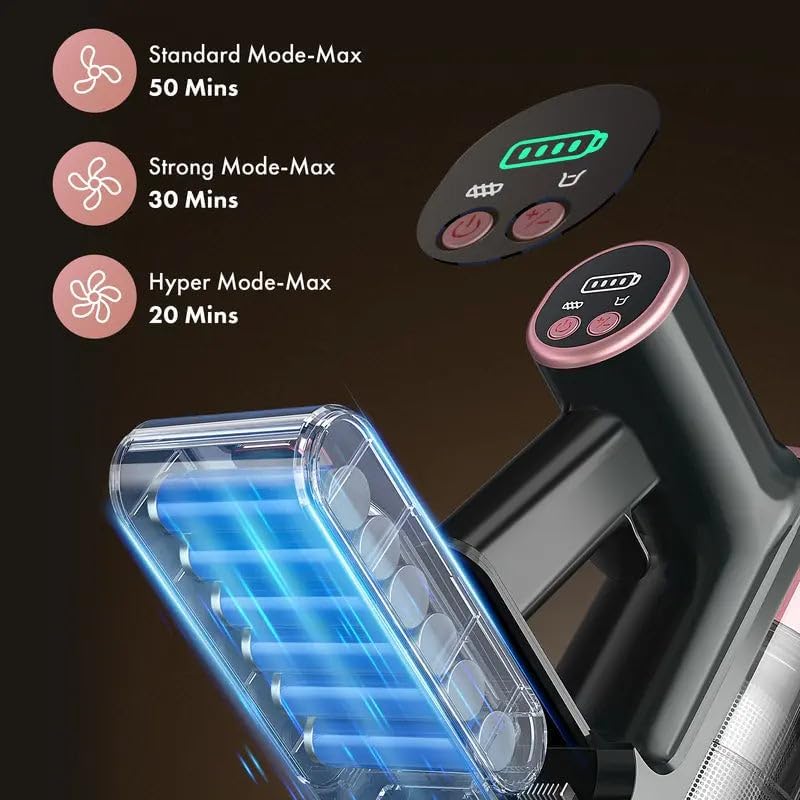 Image: The vacuum's display panel indicating different suction modes (Standard, Strong, Hyper) and corresponding battery runtimes (50, 30, 20 minutes).