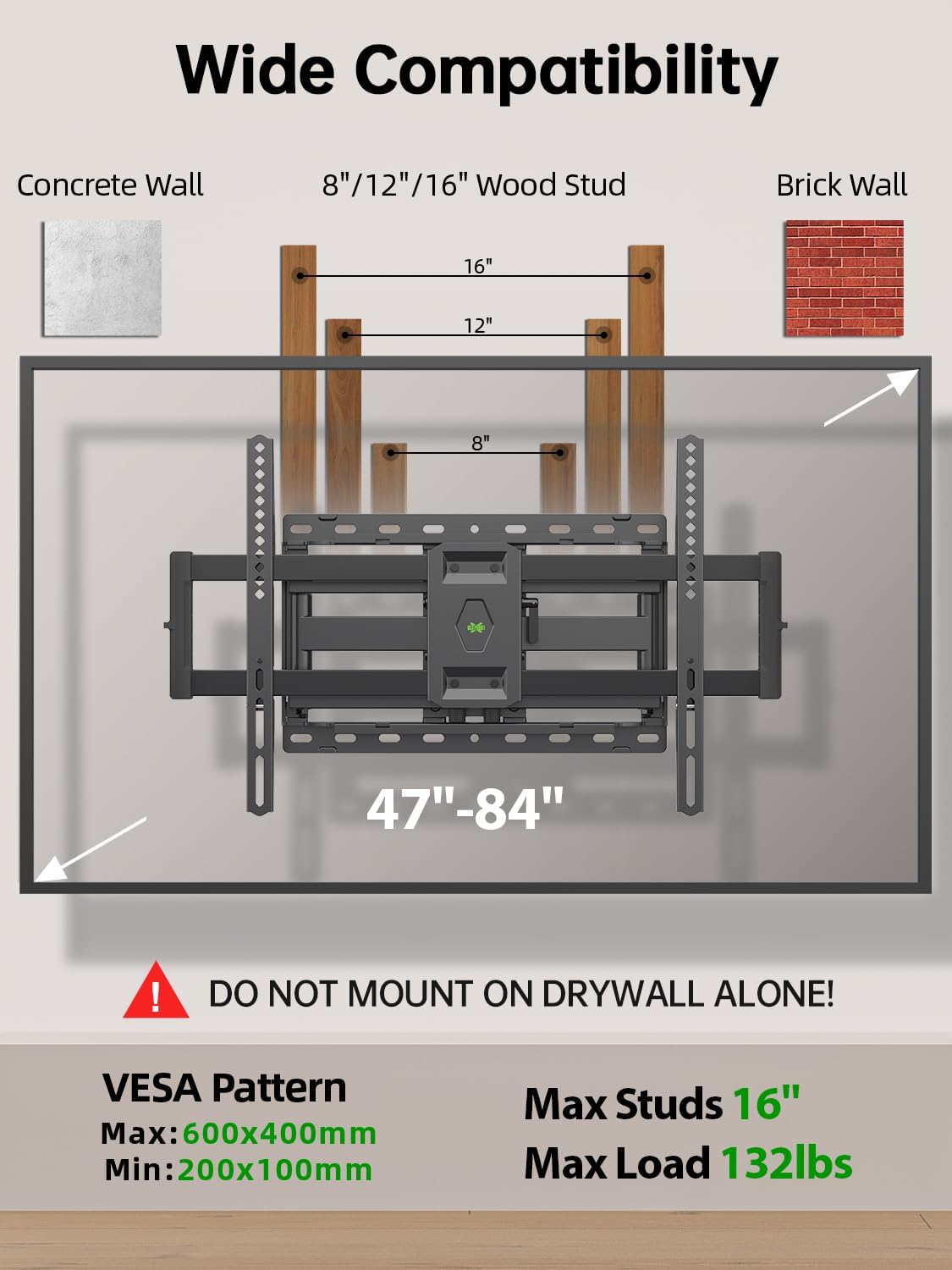 This full motion TV mount is designed for most 47-84 inch flat screen, LED, and 4K TVs, supporting weights up to 132 lbs (60 kg). It accommodates VESA patterns from 200x100mm to 600x400mm and is compatible with 8-inch, 12-inch, and 16-inch wood studs.