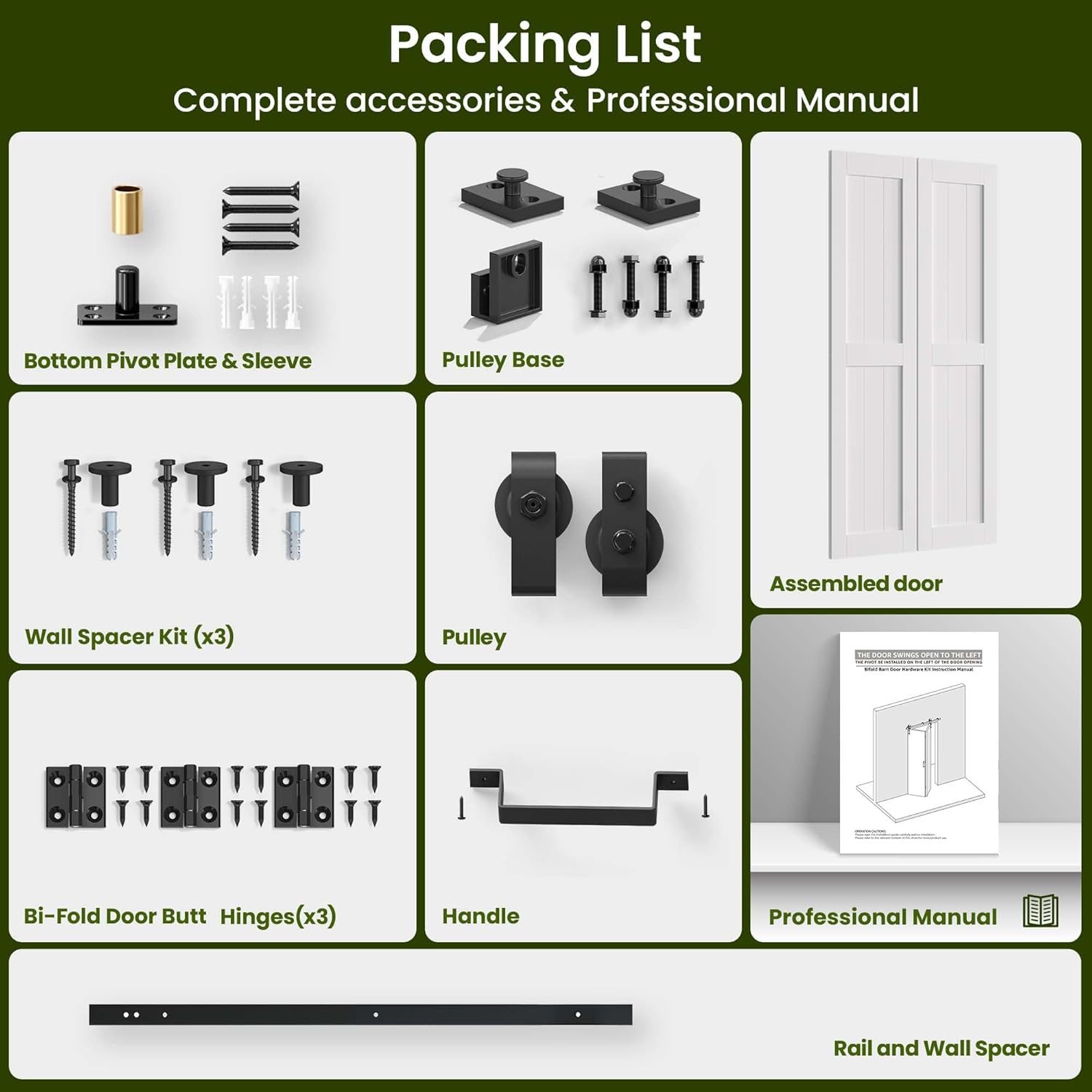 This image displays the complete set of accessories and the assembled door panels included in your package.