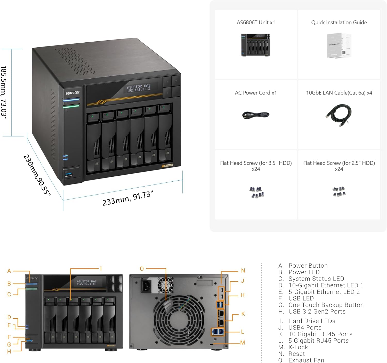 Imej: ASUSTOR Lockerstor 6 Gen3 AS6806T package contents and dimensions. This image displays the NAS unit, power cord, LAN cables, various screws, and the quick installation guide. It also shows the device dimensions: 185.5mm (7.303 inches) height, 230mm (9.055 inches) depth, and 233mm (9.173 inches) width.