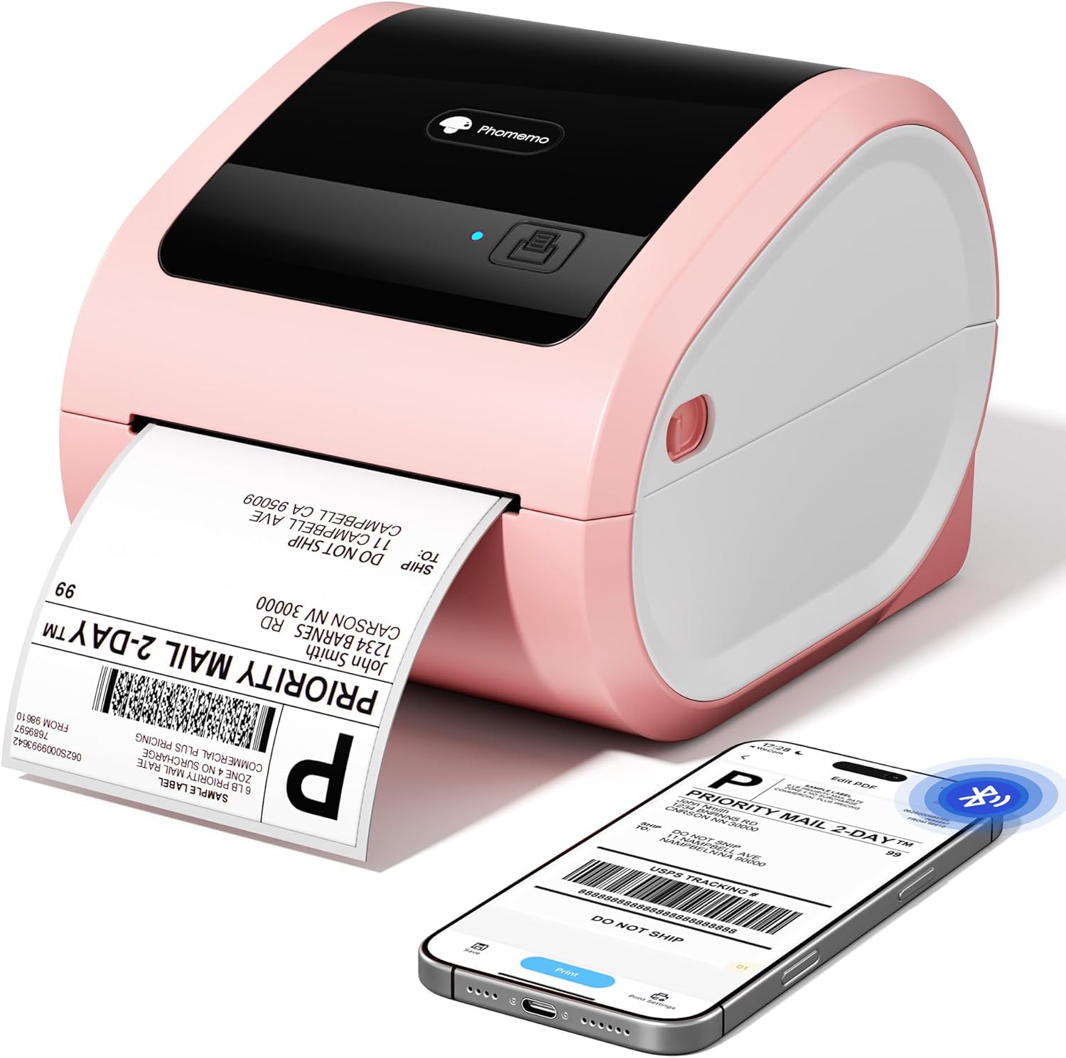 Image: The Phomemo D520BT thermal printer in pink, actively printing a shipping label. A smartphone nearby displays a digital label design, highlighting its wireless capabilities.