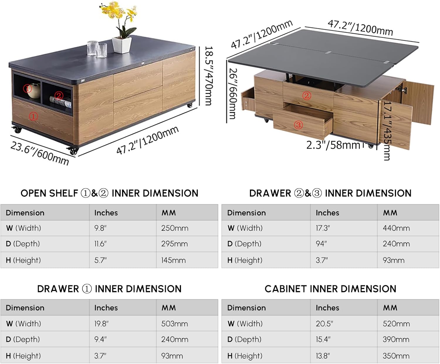 - 3-in-1 Lift-Top Functionality: Easily converts from a coffee table to a dining table or work desk, ideal for small apartments or multi-functional spaces.