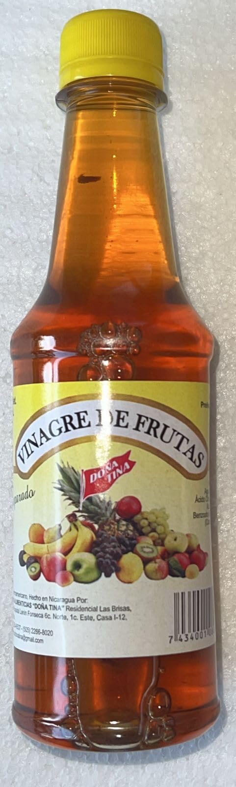 Image: A 12-ounce bottle of Generic Vinagre de Frutas from Nicaragua. The bottle is clear, showcasing the amber-colored vinegar, and features a yellow screw cap.