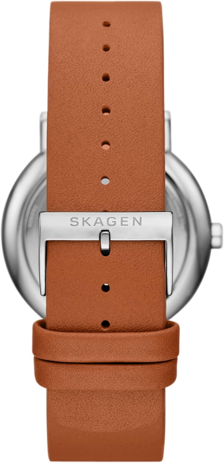 Image: Close-up of the watch's brown leather band and buckle, showing the Skagen logo on the clasp. This illustrates the band's design and attachment point.