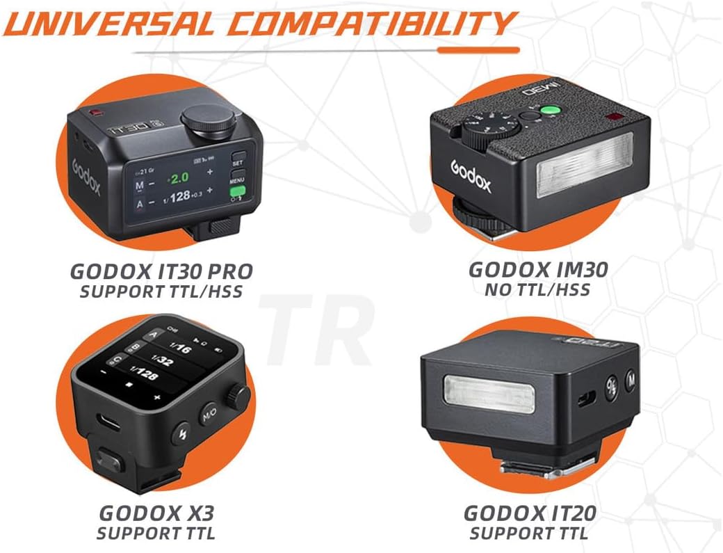 Imej 2: This diagram illustrates the compatibility of the Godox TR-F riser with different Godox flash units and triggers, including the iT30 Pro, iM30, X3, and iT20, highlighting their respective TTL/HSS support.