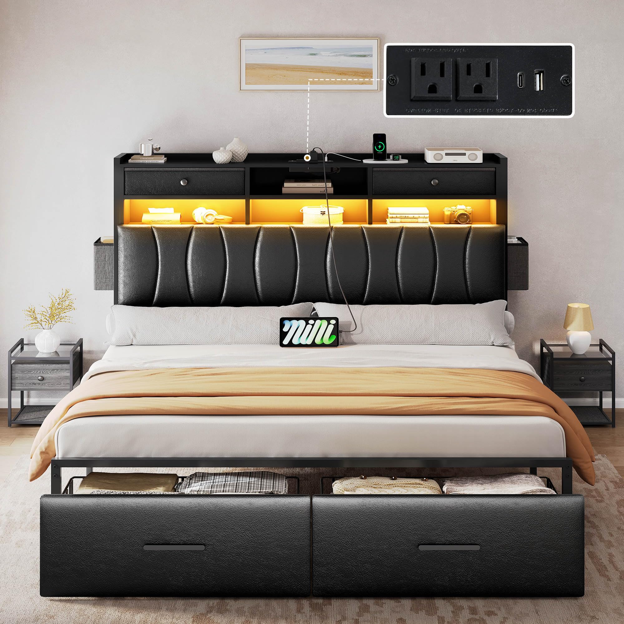 - Side Storage Boxes: Located on the sides of the headboard, these boxes offer convenient access for smaller items like headphones or remote controls.