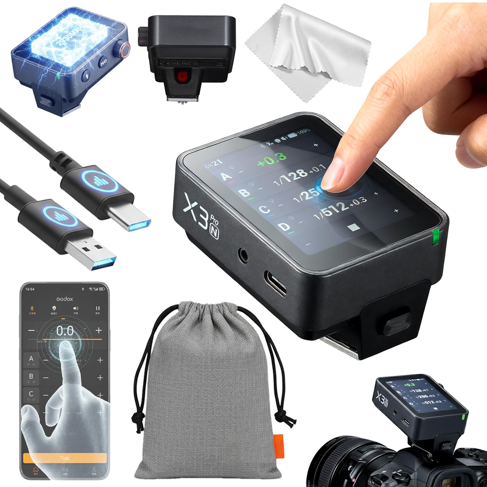 The GODOX X3 PRO N is a TTL wireless flash trigger designed for Nikon cameras, offering advanced control over your lighting setup. It features a vibrant touchscreen interface, Bluetooth connectivity for app control, and a robust 2.4GHz Wireless X system.