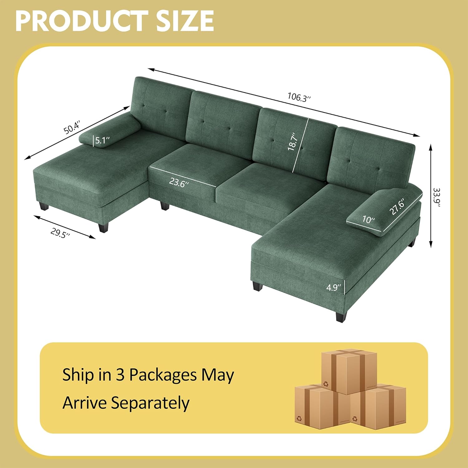 Figure 2.1: Product Dimensions and Packaging Information. This image illustrates the overall dimensions of the U-shaped sectional sofa, including depth, width, and height, along with individual section measurements. It also notes that the product ships in 3 separate packages.