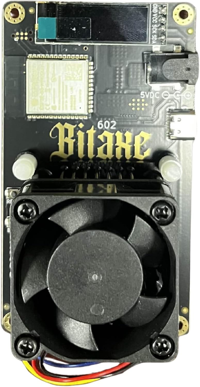 Rajah 1: Atas view of the Bitaxe Gamma 602 miner, showing the cooling fan and OLED display.
